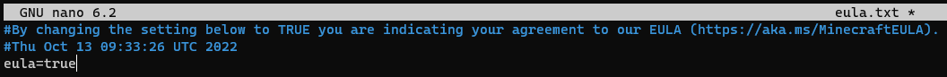 use a text editor (such as nano) to edit the eula.txt file and replace eula=false with eula=true