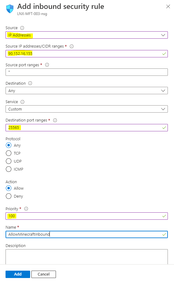 Next, simply allow inbound Minecraft traffic in Azure by creating a new network inbound port rule. Again, it would make sense to restrict it to certain IP addresses or ranges. Getting your kids and their friends to find their public IP addresses will no doubt help keep the inbound traffic safe.