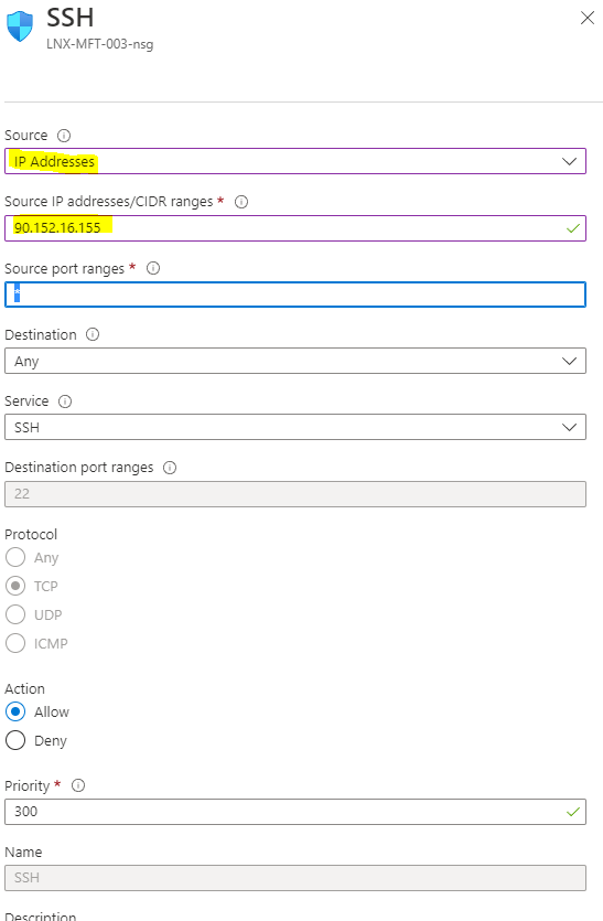 Once this is complete, go to your resource, and then click Networking. Click on the SSH rule and change it so that only certain IP addresses can access via SSH. Changing this to your specific location will limit the IP addresses or ranges that can connect via SSH.