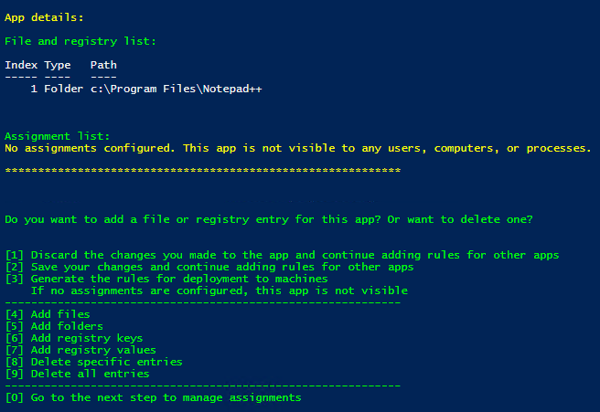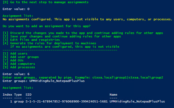 Once you’ve added all the paths you need to choose option 0 to assign the rules to a user, group, OU, computer or process (or any combination of the above). We are simply going to apply them to a group called “UPMHidingRule_NotepadPlusPlus” which we created earlier, so we use option 6 – choose the option you require as necessary