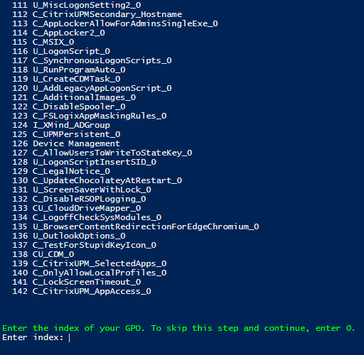 You can choose to apply them to the local machine, not apply them at all (which seems a bit mental) or apply them to a GPO. I’m not clear here how you’d apply them through Citrix Studio, if that is how you deploy your UPM settings, but maybe it gives you that option if you run it from a machine with Studio installed (I haven’t checked as I don’t often spin up my on-premises kit these days). I choose the option to deploy to a GPO because I do my Citrix policies in AD. It will then enumerate your domain and ask you which GPO to apply them to, so it helps if you’ve created a blank one before starting like I did. Give it the number of the GPO (probably the last in the list if you’ve just created it)