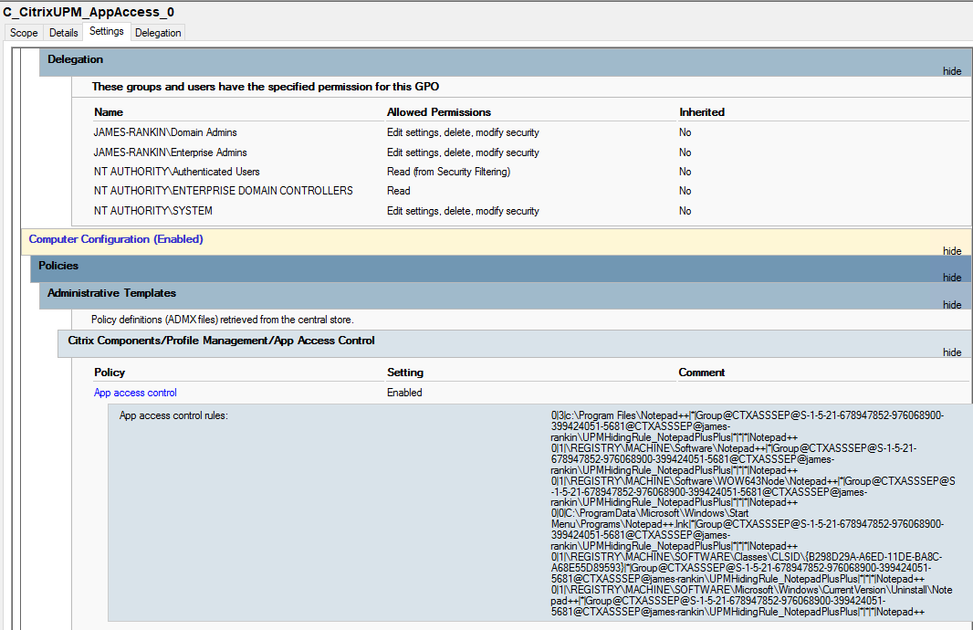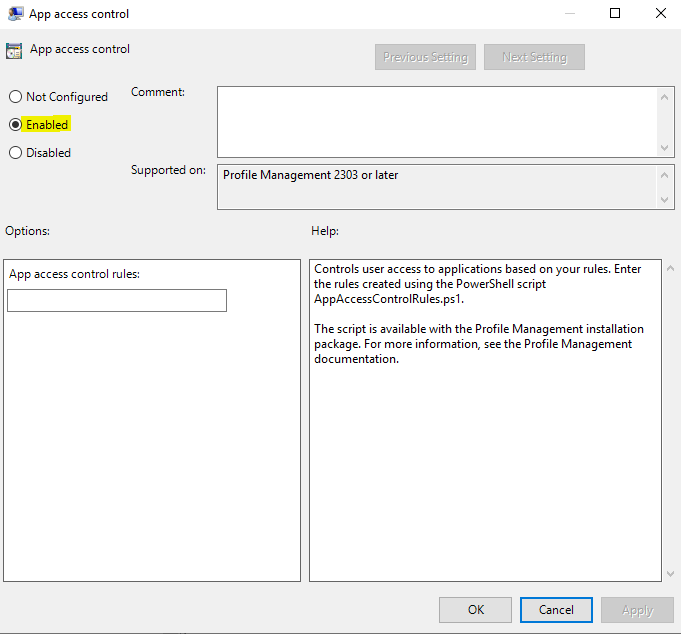 This will then automatically populate your GPO by enabling the policy for App Access Control (in a sub-node of Profile Management) and populating the rules