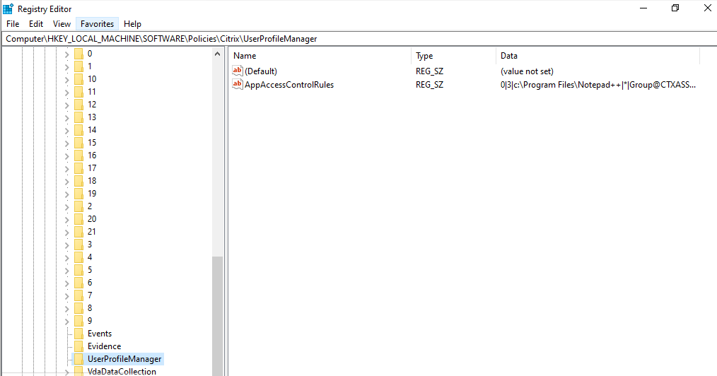 Once you apply this GPO to your target machines, the Registry will be populated under HKLM\Software\Policies\Citrix\UserProfileManager\AppAccessControlRules as below.