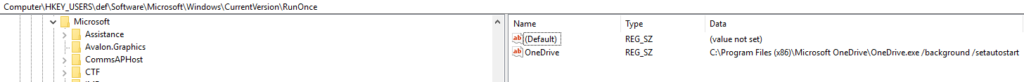 After this, I consider it best practice to, again like Teams, remove the autorun entries for the machine so that the user can choose when to invoke OneDrive from the Start Menu. This ensures that thousands of users do not all start synchronizing at once. The autorun entry for OneDrive, however, is a little tricky to find. It’s actually written into the default user profile Registry, cunningly.