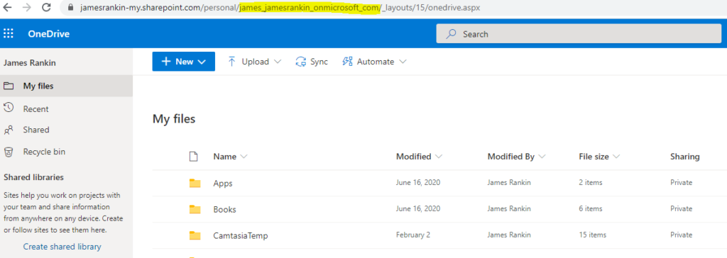 If you log in to your OneDrive through the web, have a look at the address bar and see what format the path is in. Here’s an example from my own tenant. Have a look at the highlighted section