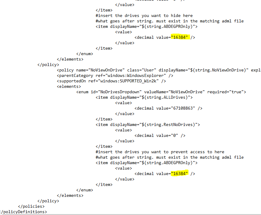 Find the combination of drive letters you require and get the numbers (for just the O: drive, as an example, the number is need is 16384). Then, download Webster’s example ADMX and ADML files, and then edit them carefully to insert your figure.