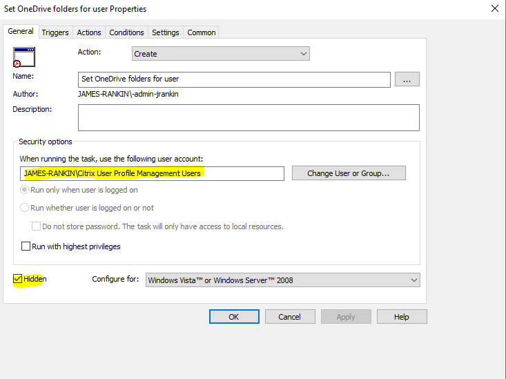 Next, we need to create a Scheduled Task to run a script after the user has logged in. Firstly, we need to create the script. What this script does is check for the Registry path we set at the end of the logon script – if it exists, it will create all the Registry values that are needed to support an Explorer folder. Then, it will pause for two minutes (because, to create a Quick Access folder, we need to write a desktop.ini file to the user’s OneDrive, and to achieve that CDM needs to have run and been authenticated, hence we are giving the user time to respond to the one-time authentication prompt). After that, it will check for the existence of the mapped drive (in our case, the O: drive, so change as necessary) – if O: exists, it will then proceed with writing the values for the Quick Access folder. If the drive still hasn’t been mapped by then, it pauses for another 30 seconds and then tries again to write the Quick Access folder – if this fails, it will simply exit, rather than constantly retrying, because the user may have decided to ignore CDM completely. However, the Registry key that controls whether this whole routine runs will only be removed if CDM has successfully authenticated – which means if the user doesn’t authenticate, it will repeat this whole process at next logon until successful.