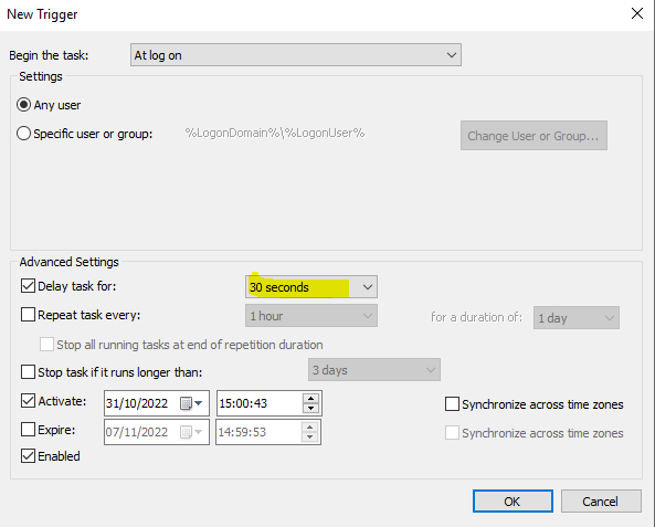 Once you’ve set this GPP up, let the policy propagate to the target machines, and you should now have a Scheduled Task on each one that runs thirty seconds after the user logon has finished.