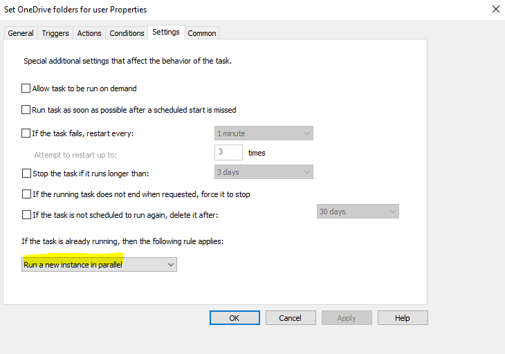 Finally, the Scheduled Task needs to be set to run instances in parallel if there is already an instance running (for multi-user environments)