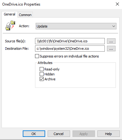 Firstly, we need to make sure we have a OneDrive icon in our image or deployed to our machines that we can use. OneDrive icons are easily available with a Google image search, so grab one, store it somewhere, and then organize some way of getting it onto your endpoints. I’ve used a Group Policy Preferences Files Action to copy it to c:\windows\system32 – pick your poison as required.