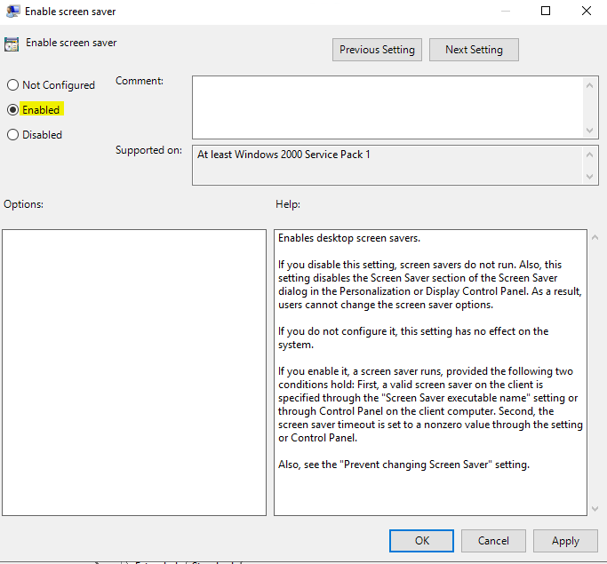 User Configuration | Policies | Administrative Templates | Control Panel | Personalization | Enable screen saver