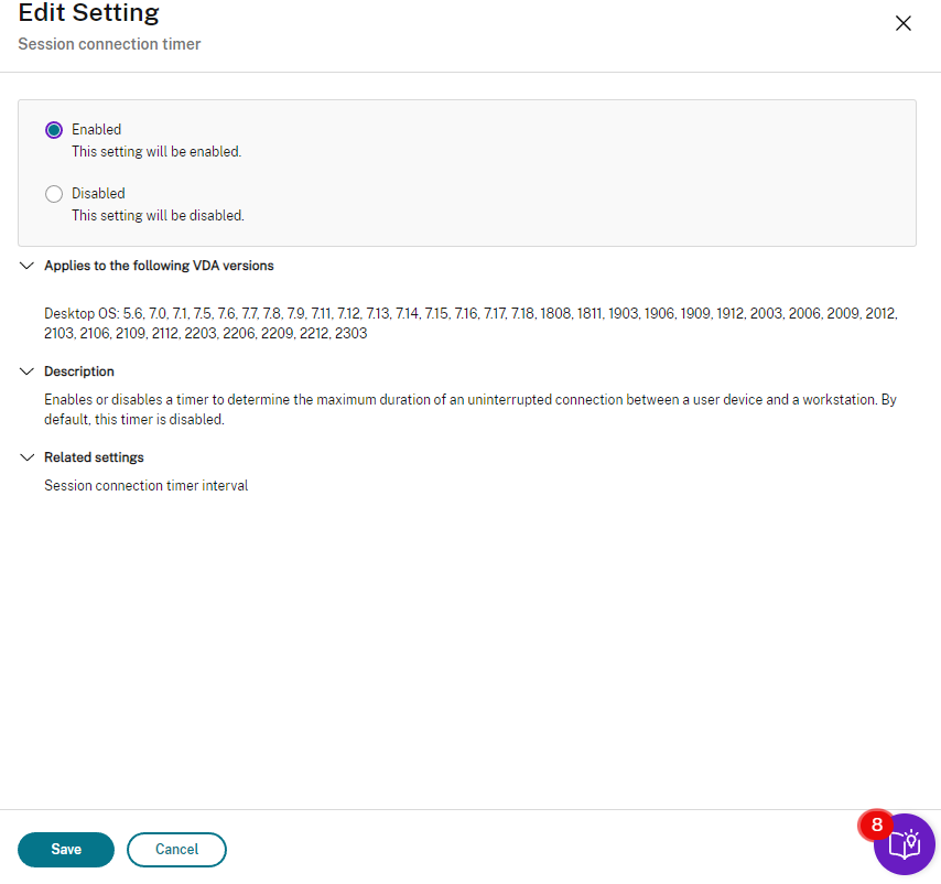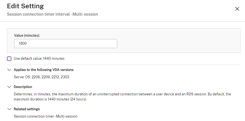 Citrix Policies | User | ICA | Server limits | Session connection timer – multi-session | Enabled (multi-user sessions or RDSH)