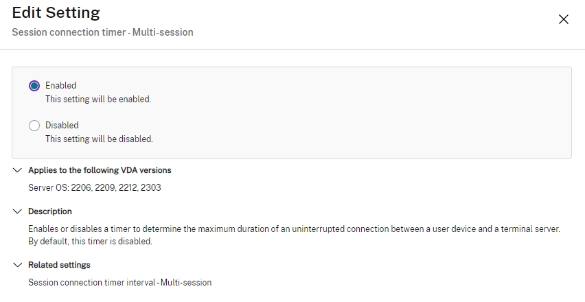 Citrix Policies | User | ICA | Session limits | Session connection timer | Enabled (single-user sessions only)