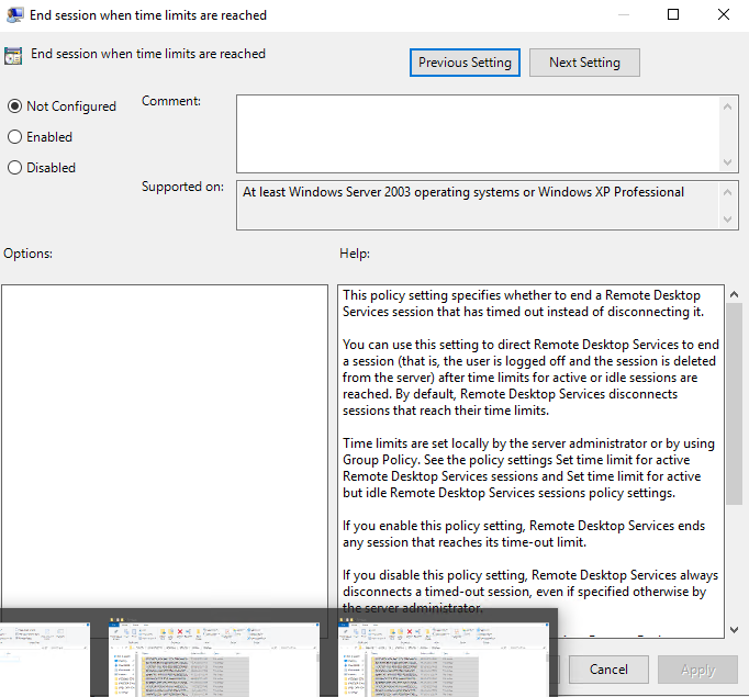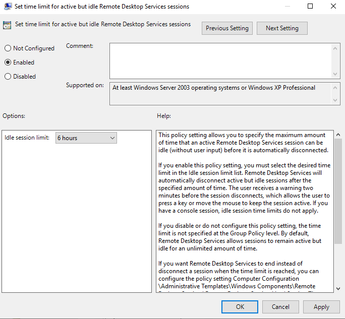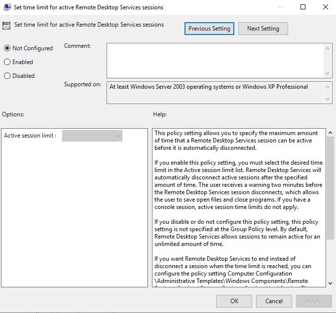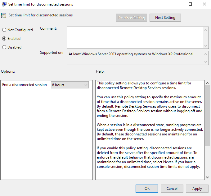 This setting refers to the threshold for both Active and Idle limits and means that rather than disconnect a session that has breached either of these limits, it will end it completely (reset it). Unless you’re actively trying to annoy your users or you have a security mandate specifically demanding it, I’d leave this setting as Not Configured or Disabled.