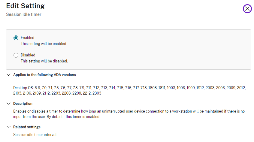 Citrix Policies | User | ICA | Session limits | Session idle timer | Enabled (single-user sessions only)