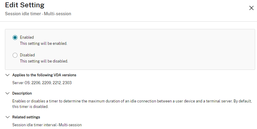 Citrix Policies | User | ICA | Server limits | Session idle timer – multi-session | Enabled (multi-user sessions or RDSH)