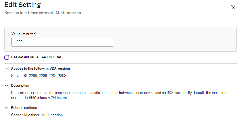 Citrix Policies | User | ICA | Server limits | Session idle timer interval – Multi-session | set value (multi-user sessions or RDSH)