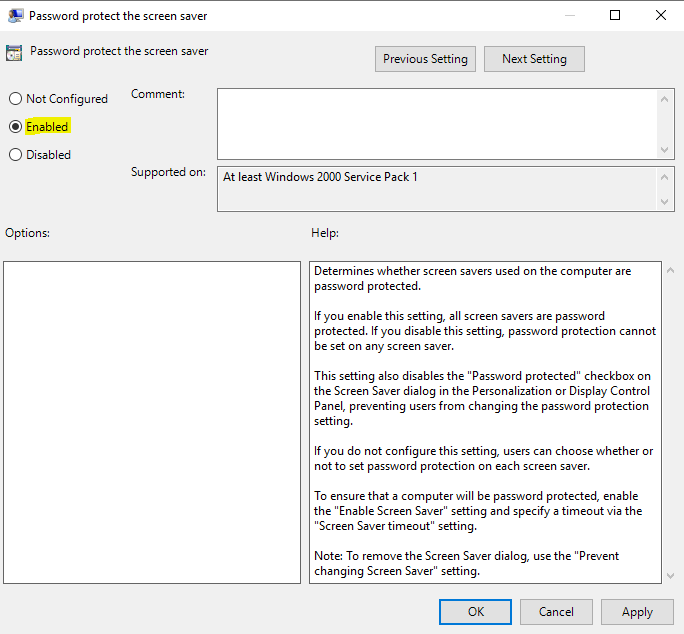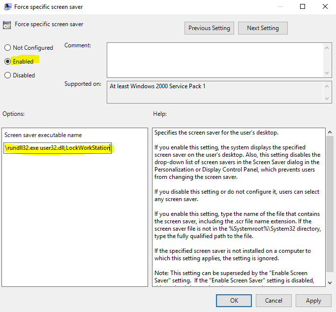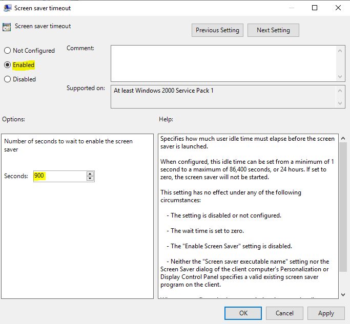 If you needed to apply these settings on a per-user basis to shared machines, then you would probably need to leverage the old “screen saver” setting which is a User Configuration item. I would recommend that you should use the “machine inactivity limit” GPO wherever possible, and if different settings are required for different groups of users, keep the devices in separate OUs or filter the GPOs specifically to them. If you cannot avoid applying these per-user on the same machines, use the settings below