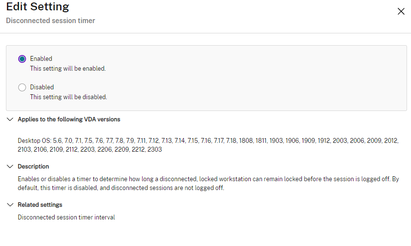 Citrix Policies | User | ICA | Session limits | Disconnected session timer | Enabled (single-user sessions only)
