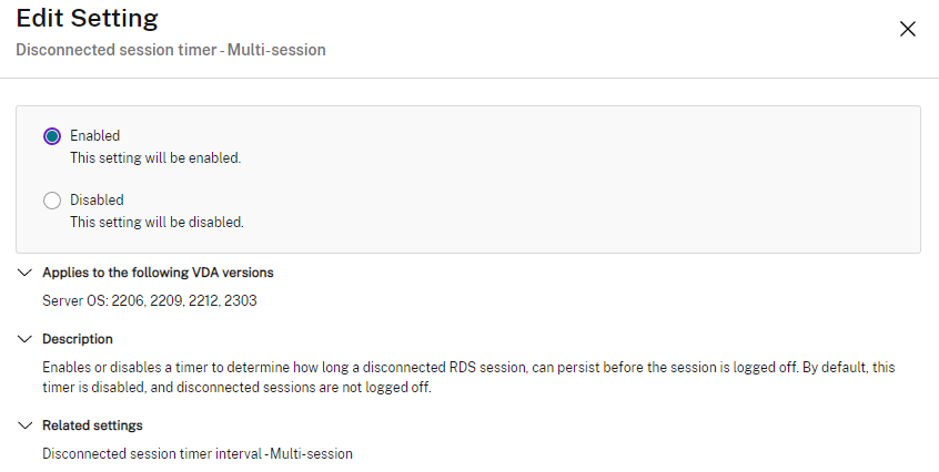 Citrix Policies | User | ICA | Server limits | Disconnected session timer – multi-session | Enabled (multi-user sessions or RDSH)