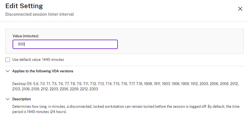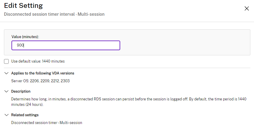 Citrix Policies | User | ICA | Server limits | Disconnected session timer interval – Multi-session | set value (multi-user sessions or RDSH)
