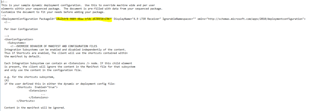 We now need to create the masking rules for the legacy client. What you need is the GUID that your App-V package will use, and the easiest way to do this is simply to read the package ID from the packagename_DeploymentConfig.xml file. Open the file in a text editor and find the highlighted text – the package I created is shown below